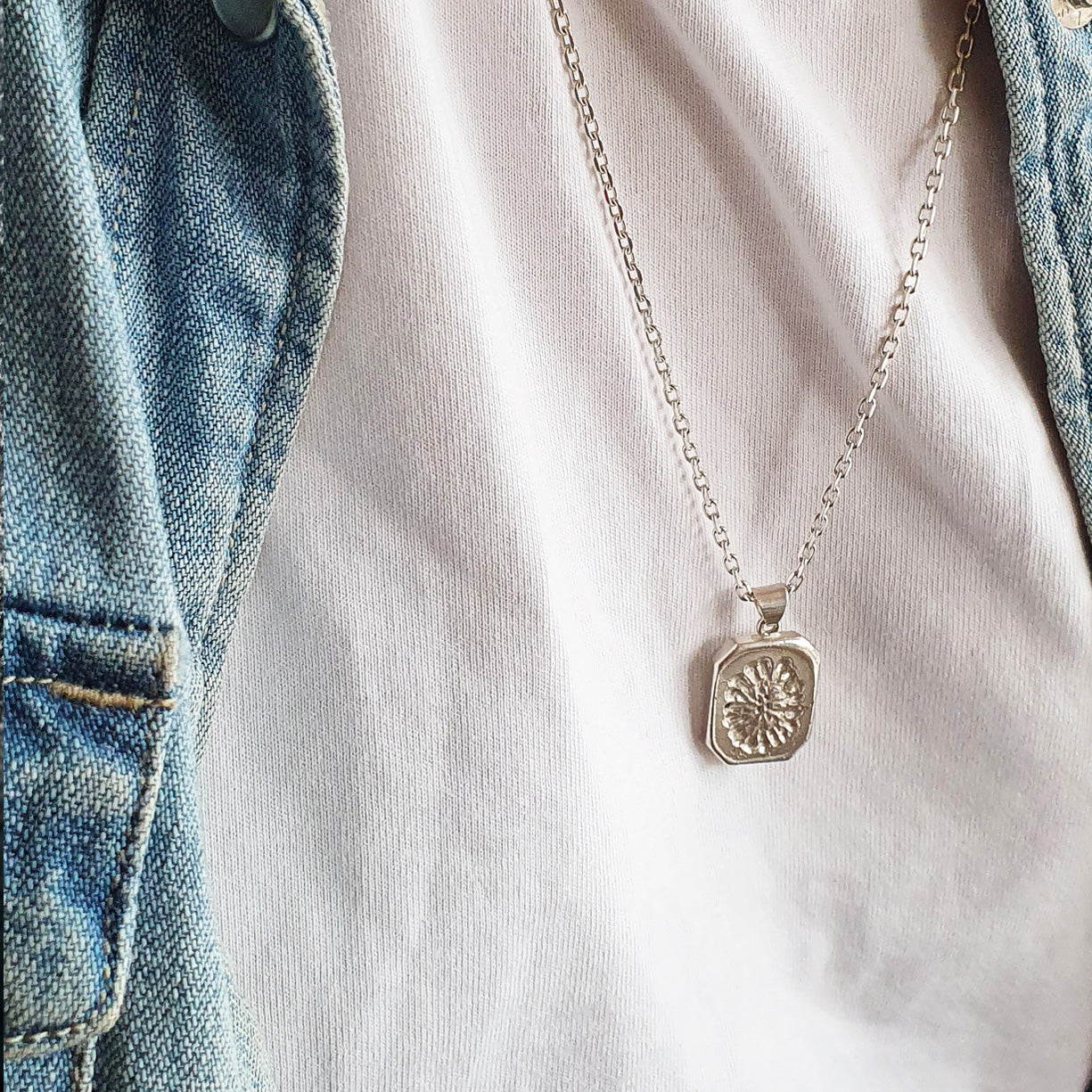 Cadena prisma y colgante flor Malva de plata. Largo 60cm