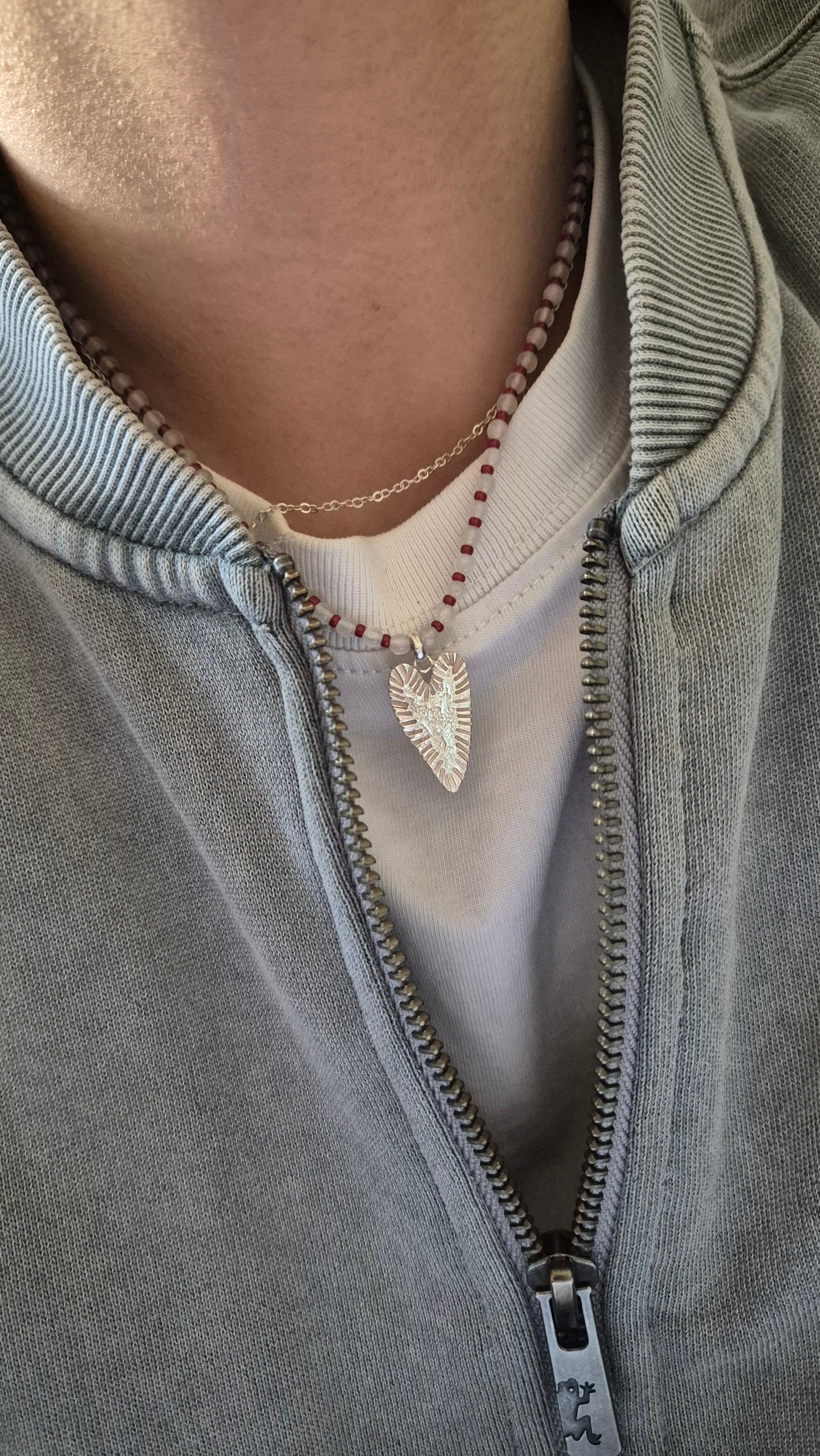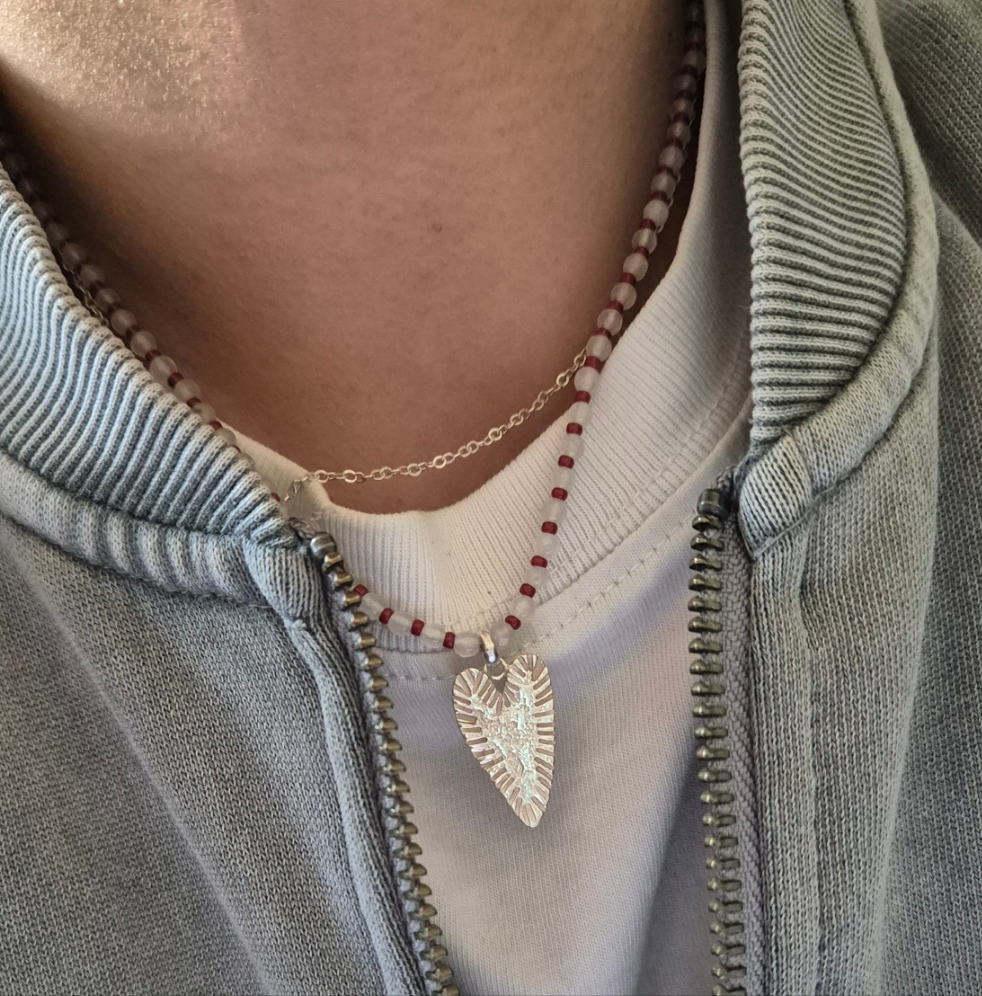 Collar de piedras agata blanca, mostacillas mini miyuki rojos y colgante de plata Valeriana.